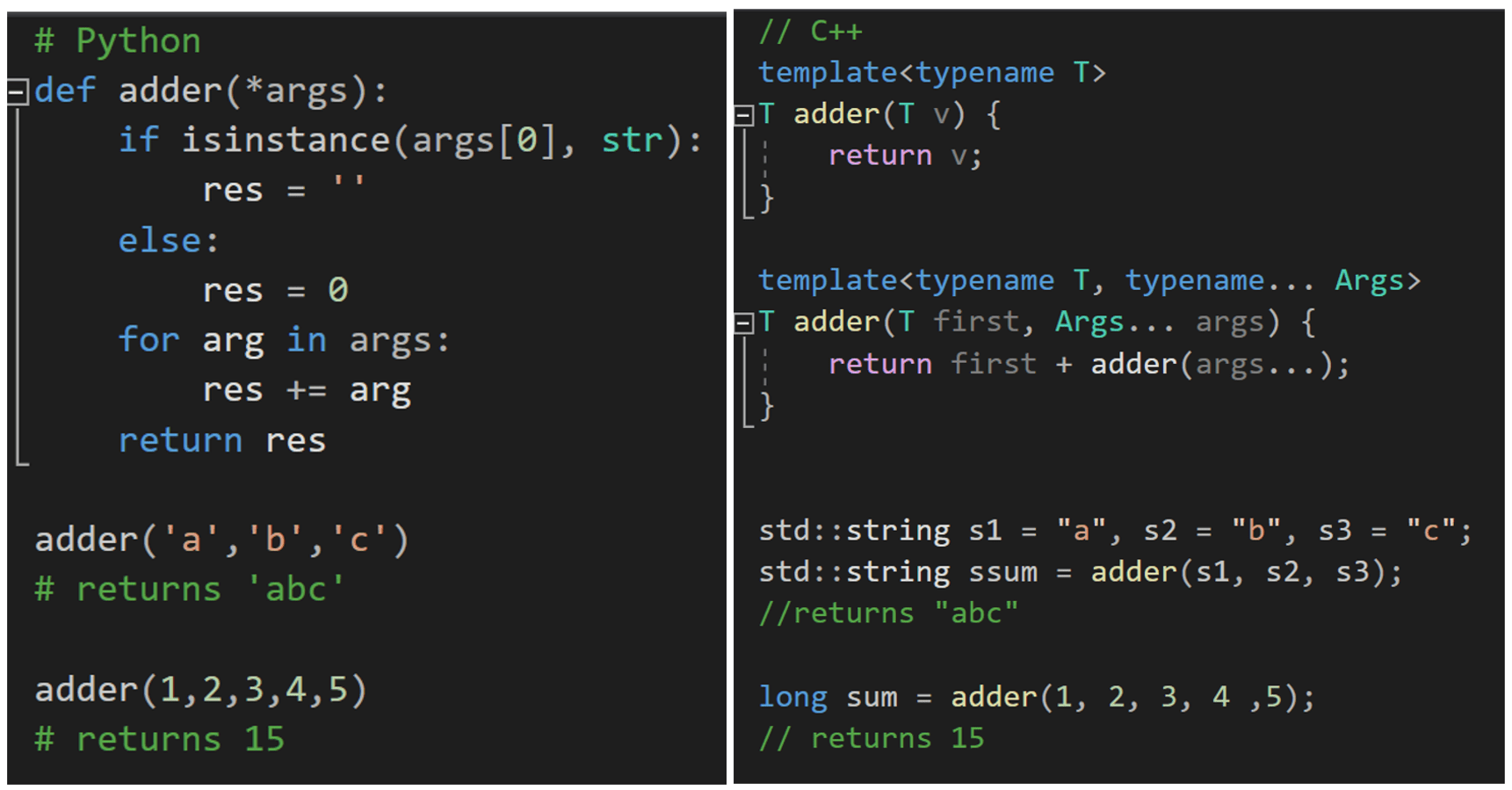 Unlike our Python function, the C++ adder leverages recursion. Every argument passed into adder is mapped down to the base version of the adder function (the first adder(T v) you see in the C++ code above), and eventually, we arrive at our solution. Additionally, notice the template<Typename T> that rests above the adder call – since C++ is more explicit than Python, this is a method for creating generic C++ return types. template<Typename T> means adder can return any type as long as the plus operator (+) is defined for those arguments. In the event the arguments do not have a plus operator, we will encounter a compile-time error. Thus, the C++ function differs from its Python analog because it leverages recursion and will fail to compile if the arguments do not have a plus operator.